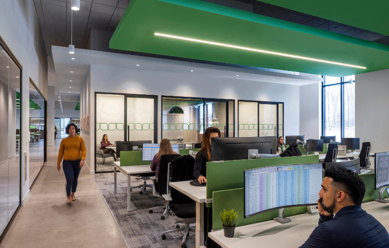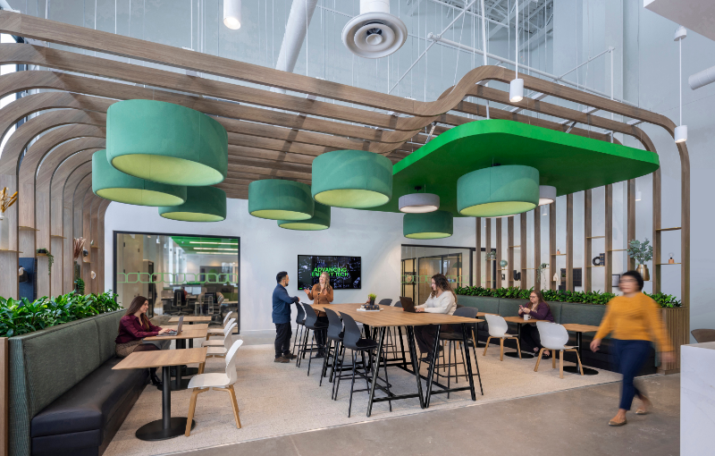The design of the industrial workplace is transforming. This shift reflects broader changes in tenant expectations, operational complexity, and the role of industrial buildings within urban and regional ecosystems. Some recent examples include Schneider Electric, located in Milton, Ontario – a 90,000-square-foot industrial fit-out with an XSF workplace within a net-carbon-zero facility that converted a heat-pump system to electrification. The office features vibrant green accents, warm wood accents for indoor canopies, acoustical felt fixtures and treatments, and ergonomic height-adjustable workstations to elevate the employee experience, attracting talent to the workplace.