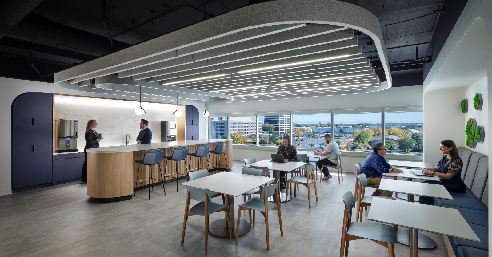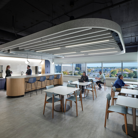 The new headquarters features an inviting atrium and branded welcome center connected to a work café, as well as engineering libraries, coworking zones, and hospitality-forward amenities that encourage collaboration. Open ceilings with floating acoustic clouds, natural finishes, and custom environmental graphics inspired by NTN’s precision bearing technology create a dynamic balance of engineering and artistry. Enlarged imagery of NTN’s patented bearings appears as sculptural and textural elements throughout the space, celebrating the company’s heritage of mechanical innovation.
