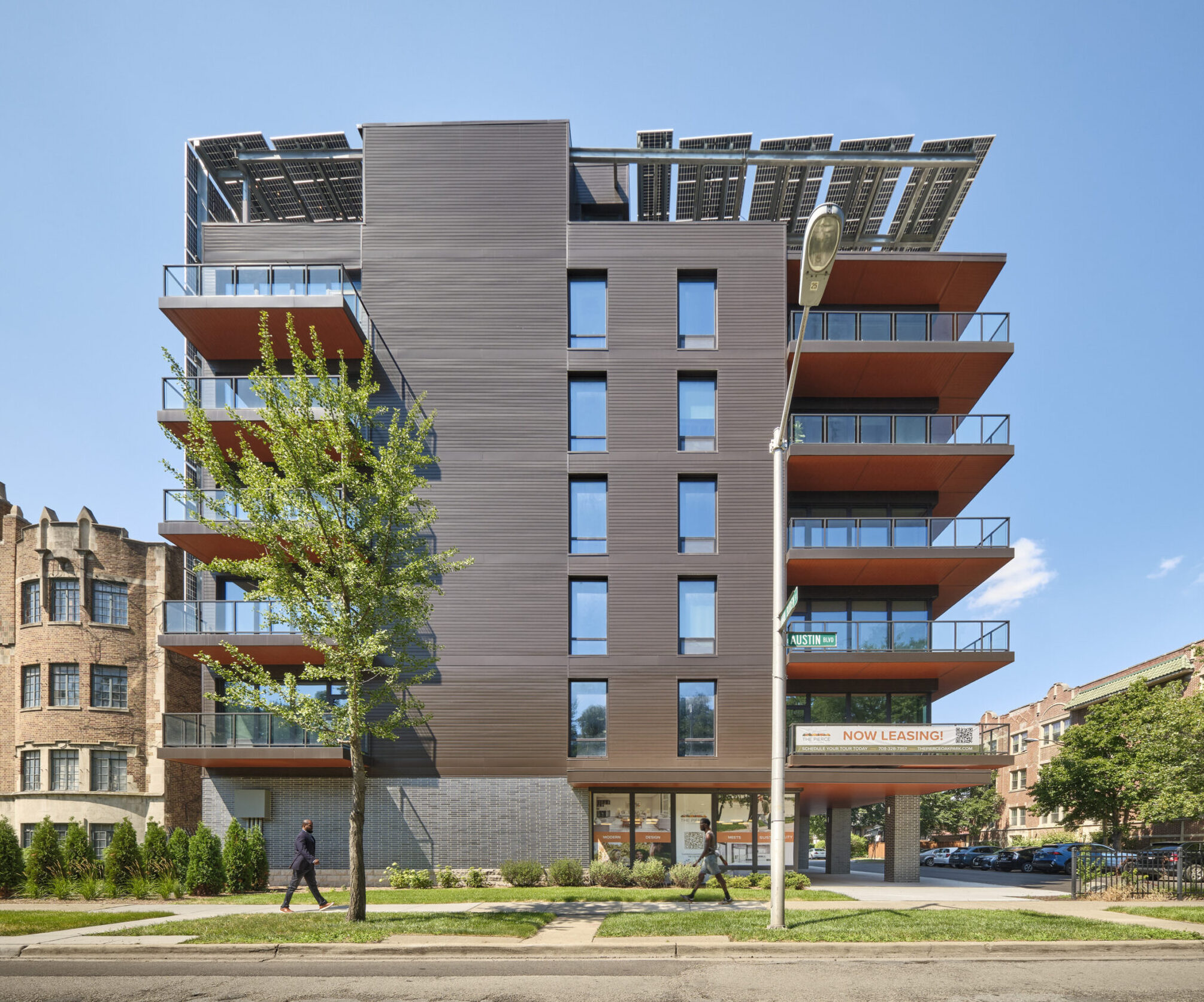 Power production is provided by a unique solar panel array that doubles as a shade structure over the roof deck featuring stunning views of downtown Chicago and Oak Park. The solar panels create a dynamic rooftop environment, blending energy production and education with an attractive amenity. Twenty percent of the building’s units will be reserved for individuals earning at or below 50% of the area’s median income, while the remaining 80% will be rented at prevailing market rates. This mixed-income concept, coupled with the building’s NetZero design, is part of the developer’s commitment to developing economically diverse and sustainable housing for the region.