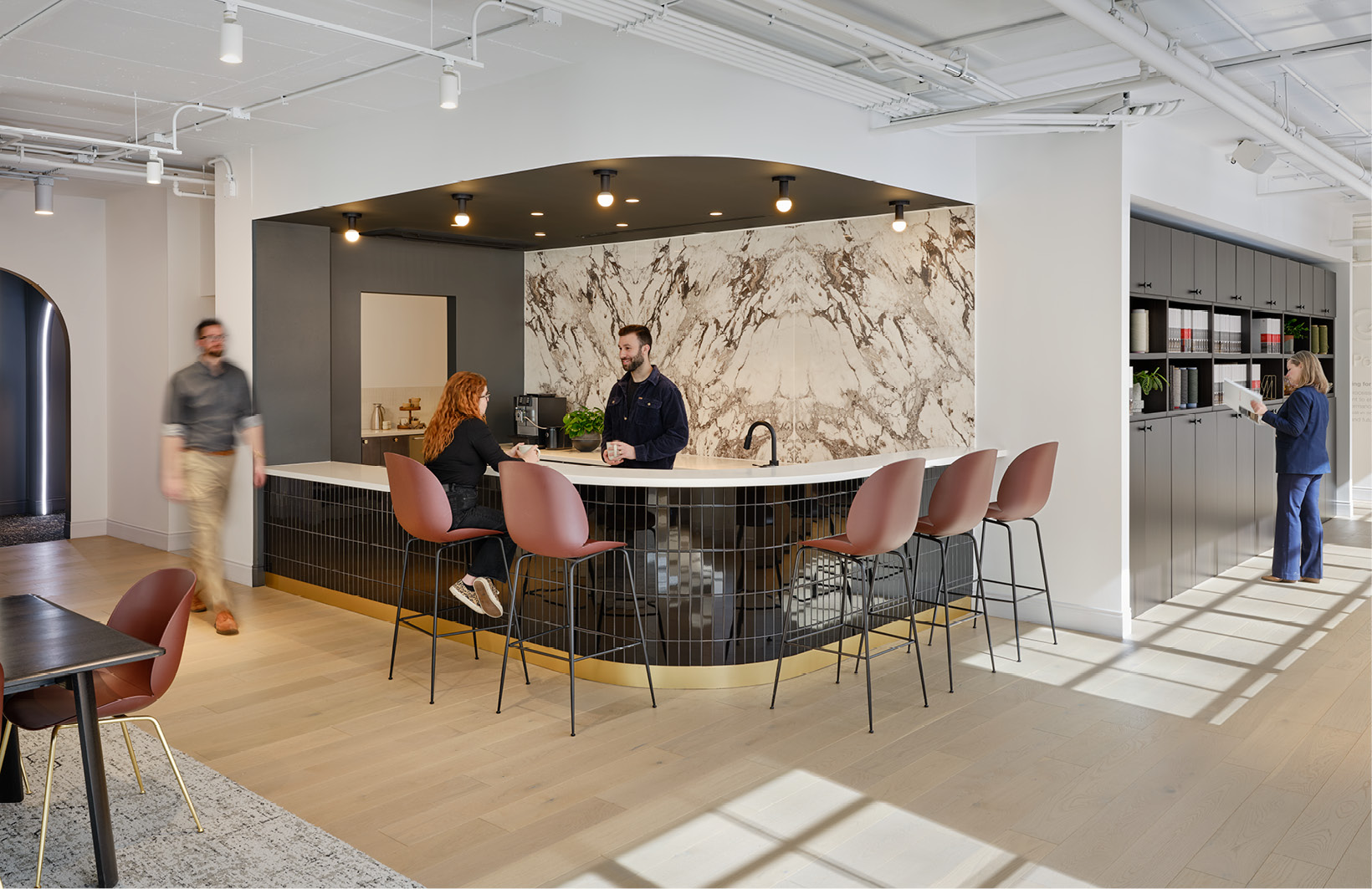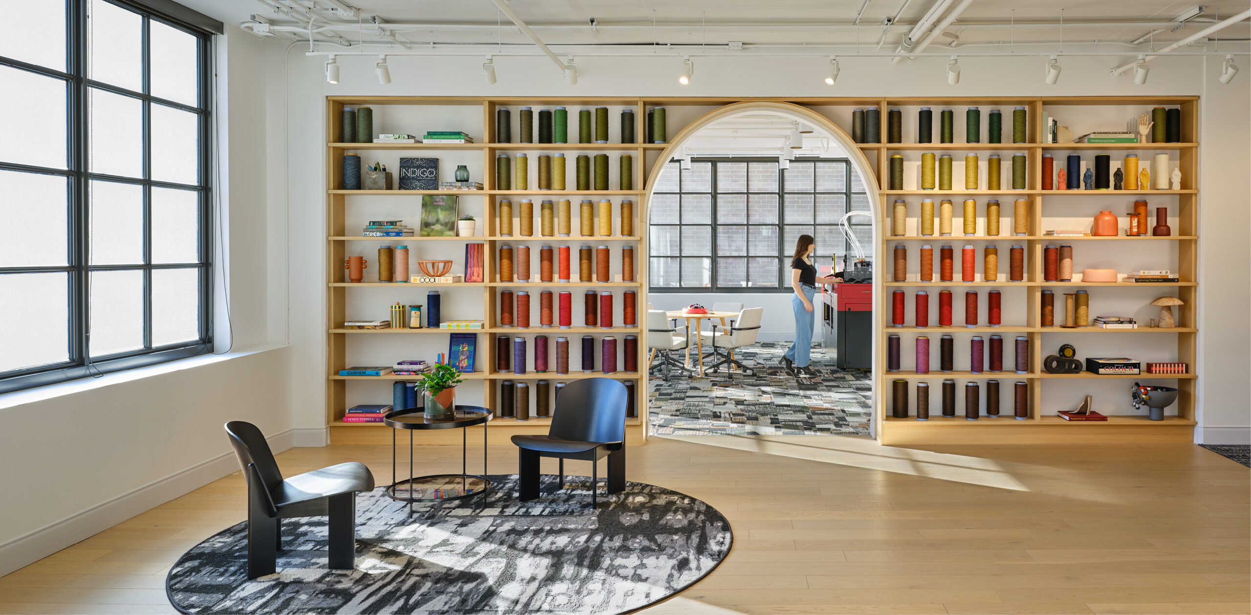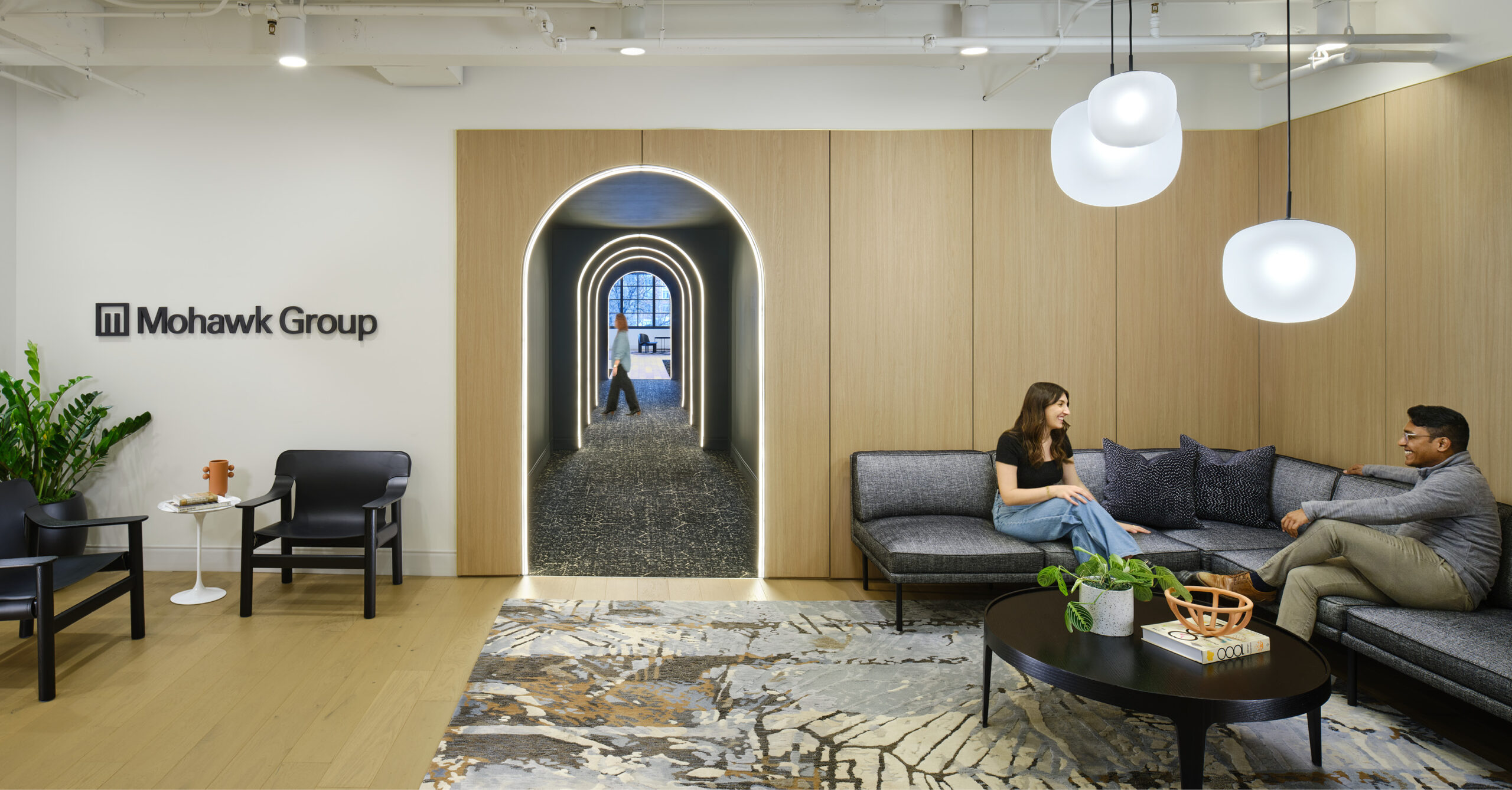 Mohawk Group’s new showroom brings hospitality-inspired design to the workplace, creating a dynamic setting for the Chicago architecture and design community, client events, and daily work. Visitors are welcomed by a cozy lounge and guided through a dramatic corridor into a bright, expansive showroom anchored by custom seating and a central hospitality bar. A dedicated maker room features Mohawk’s Personal Studio, where clients can design custom carpets and watch samples tufted in real time. Beyond the showroom, flexible workspaces and integrated storage support the local sales team, making this space both inspiring and highly functional.