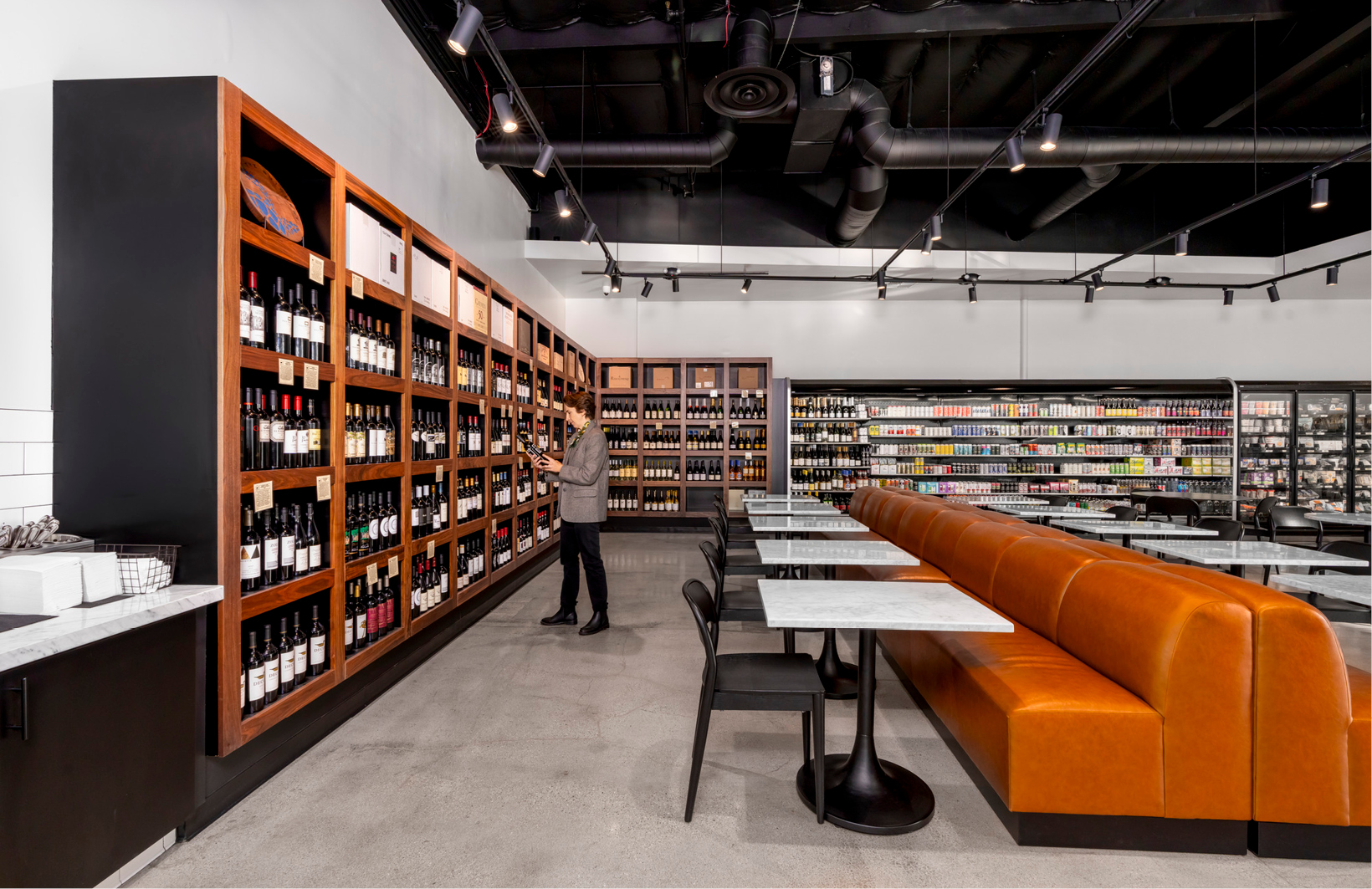 Interior architectural design services for a 6,000 SF specialty retail grocery space in an existing standalone building in a shopping center. The Butchery is a full-service butcher shop offering hand-selected meats and thoughtfully curated provisions including artisan cheeses, craft beers, and wine. The location also includes a full-service kitchen and a stylish 45-seat indoor dining space where customers can enjoy made-to-order meals. The project also included upgrading the restrooms for ADA compliance and creating additional storage and deli case.