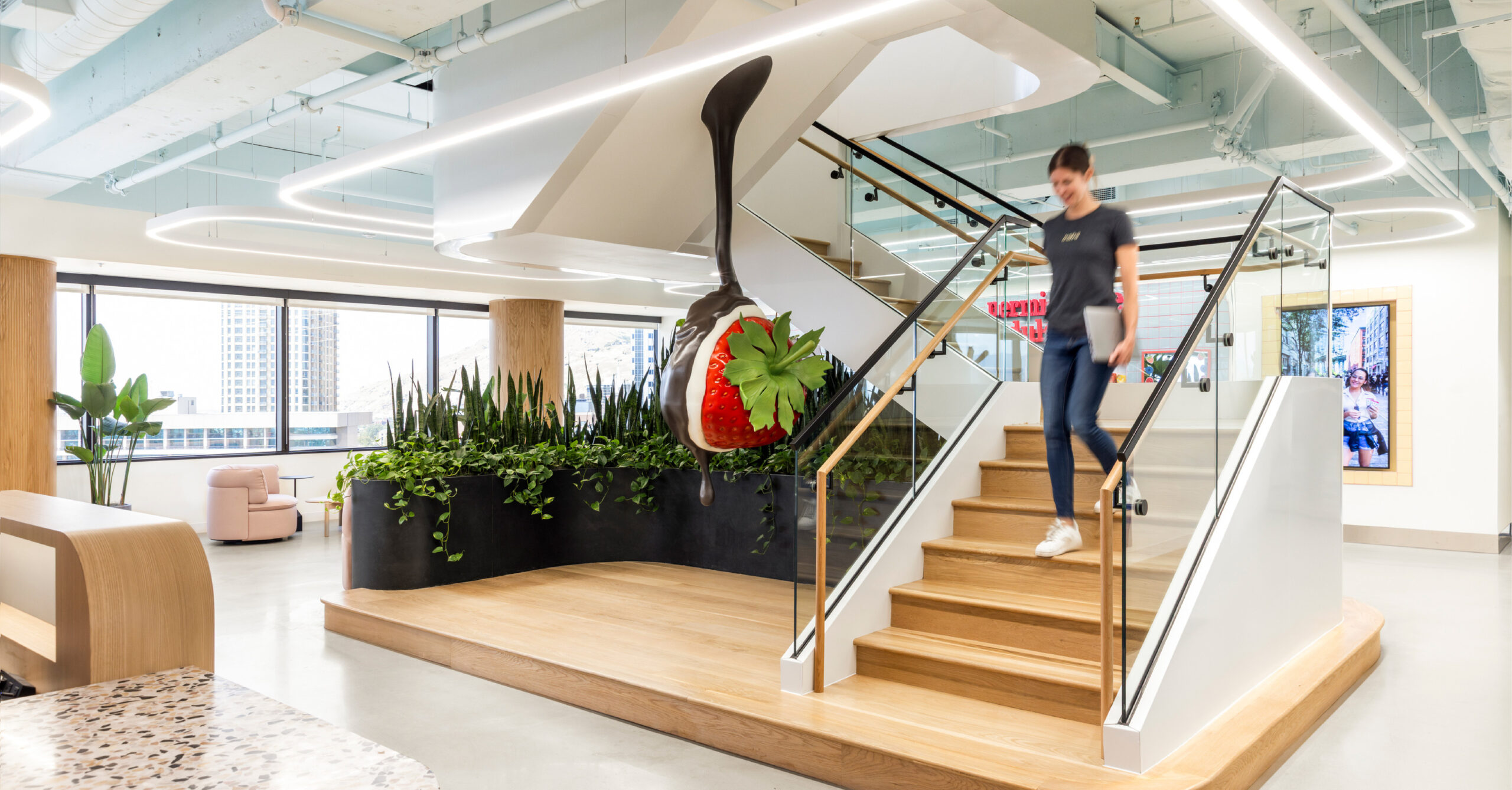 Natural light, greenery, and branded design elements are integrated throughout to enhance employee well-being and reinforce a cohesive visual identity. The workplace is designed to feel fun and energetic, incorporating playful details, custom signage, experiential moments, and adaptable furniture layouts that promote flexibility and engagement.